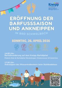 Mit dem Frühling beginnt die Zeit, wieder bewusster in Kontakt mit der Natur zu treten. Am Sonntag, 26. April 2026, wird die Barfußsaison feierlich eröffnet – mit einer Barfußwanderung auf dem Kneipp-Barfußpfad und dem anschließenden Ankneippen des Wassertretbeckens.